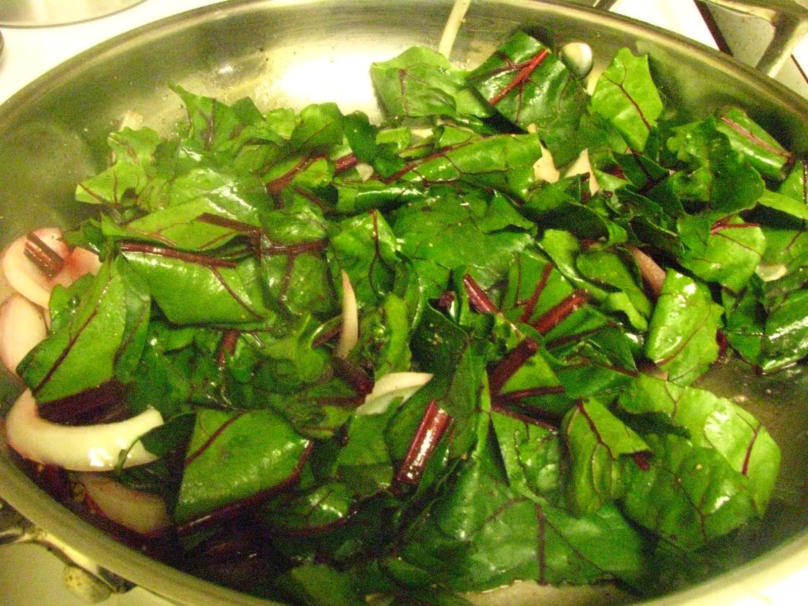 Heat evoo and onions. Add in garlic (finely chopped or use a zester). Add in wine and let simmer. Add in beet greens and cook on medium for about 7-10 minutes.