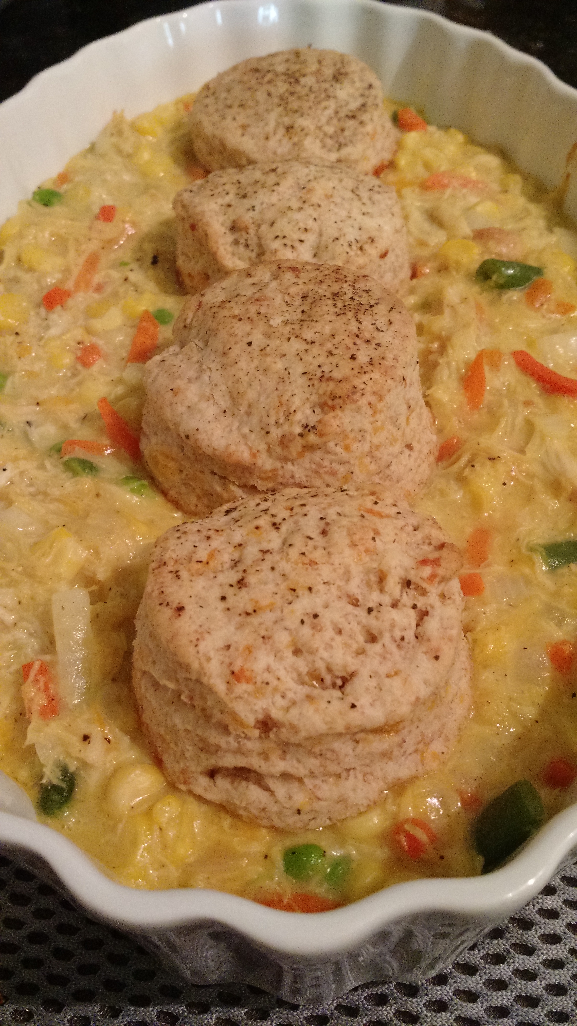 - Top with thawed biscuits.