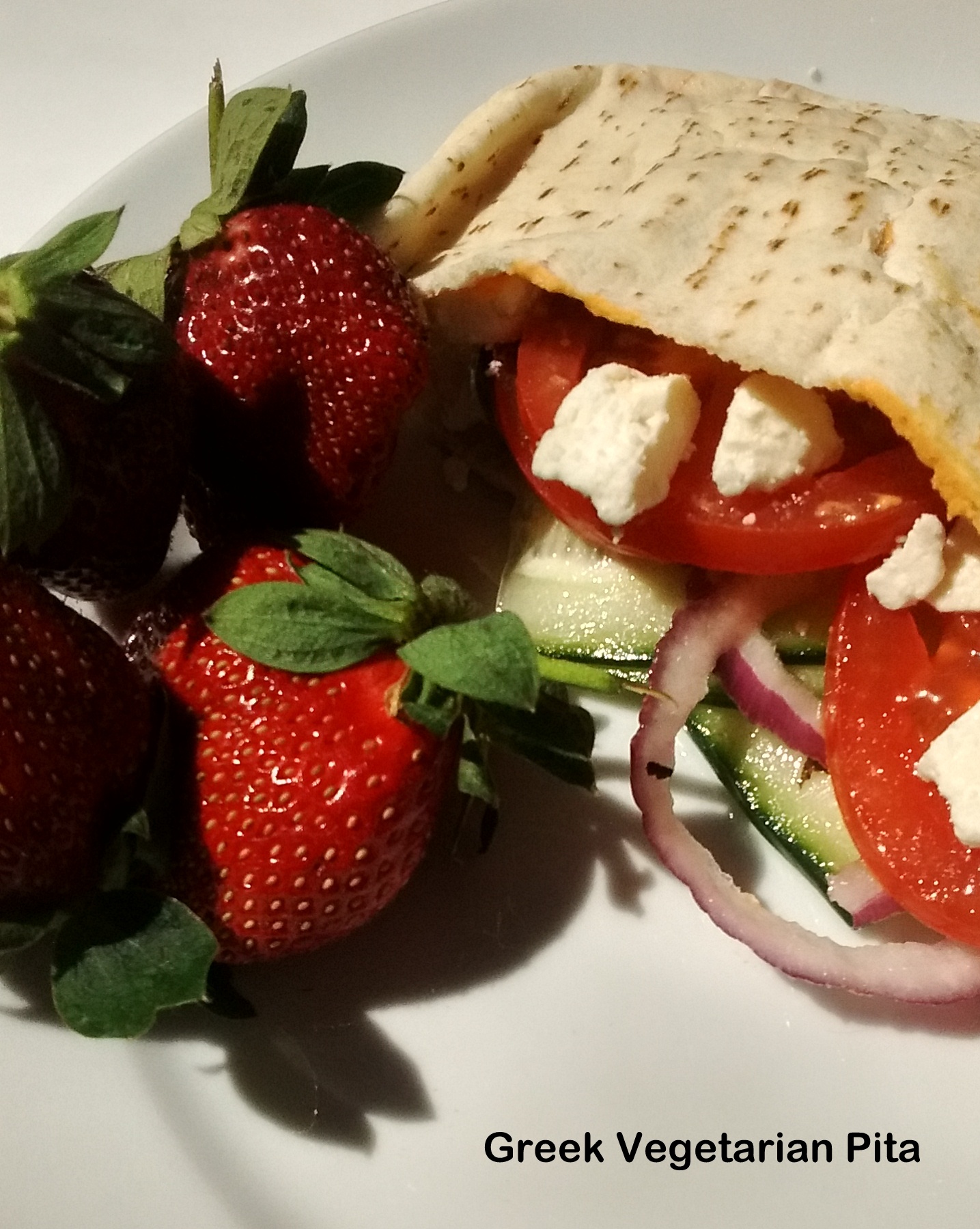 I used the roasted red pepper to make a vegetarian Greek pita. Just spread on the hummus on the inside of a warmed pita: and stack it full of cucumbers, red onions, tomatoes, and feta – all marinated in a greek dressing of your choice. Super good, and light – perfect for the summer months.