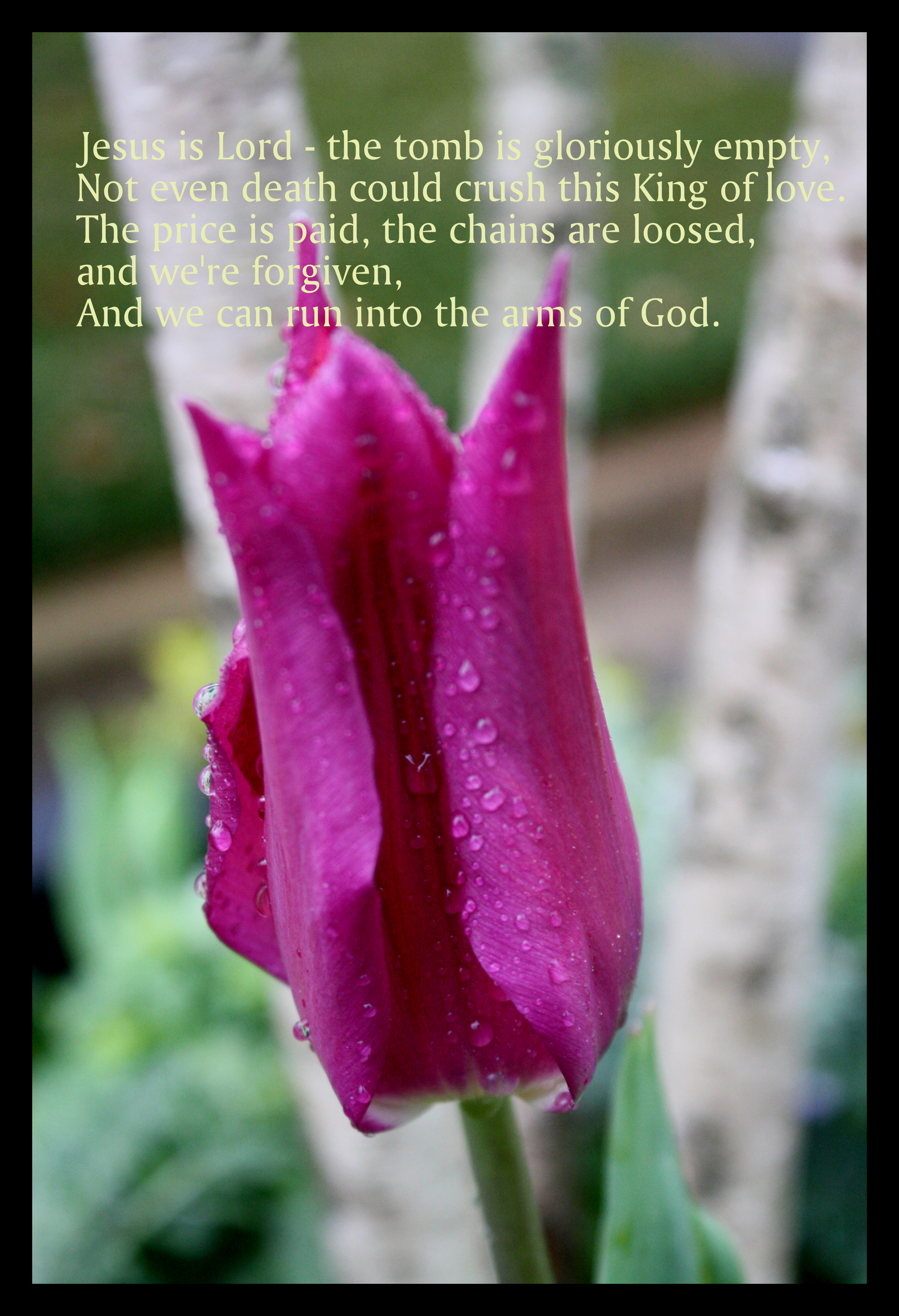 The cedars of Lebanon bow at His feet, The air is perfumed with His breath. His lips as a fountain of righteousness flow, That waters the garden of grace,